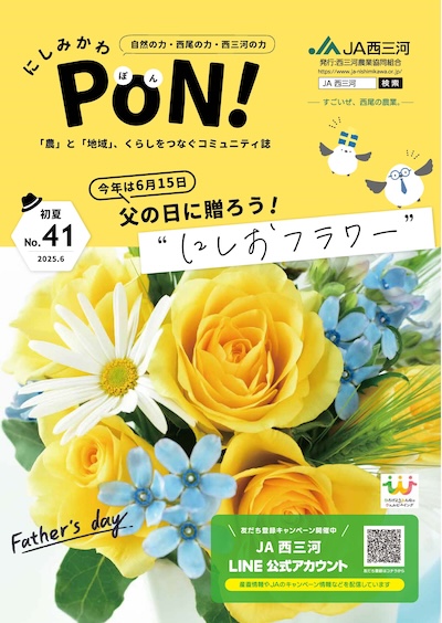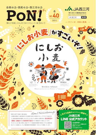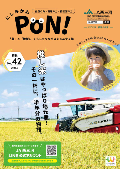 JA西三河では2014年度よりコミュニティ誌「にしみかわPoN!」を発行し、西尾市内に発行される新聞に折込む形で地域に届けています。2016年度以降は、地域農業を応援するための地域情報誌として位置づけ、発行回数をそれまでの年2回から年4回に増やしています。