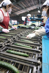 今年は日照量が少なく生育が遅れ気味であるものの、色が濃くイボ立ちのよい良質なキュウリが持ち込まれ、選果場ではパート選果員が等階級別に選別されたキュウリの箱詰め作業に取り組んでいます。機械選果できない規格は手作業で選別し、すべての部会員が出荷を開始する11月20日頃に本格的な出荷シーズンを迎える見込みです。