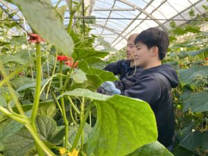 9月に公陽選手が定植した約40株が順調に育った区画で両選手は専用のきゅうりカッターを使った収穫のほか、蔓下げや袋詰めなど、一連の作業に挑戦。最初は慣れない手つきであったもののすぐにコツを掴み、楽しみながら作業にあたりました。