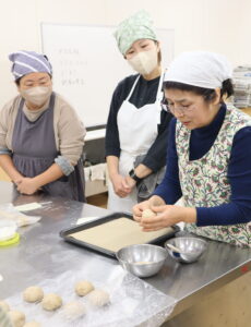 参加者はLINEで募集し、当日は市内でパン教室を開いている阪部菜穂子さんが講師を務めました。教室ではビニール袋で材料を混ぜて生地を作り、クリスマスの定番であるシュトーレンと、アレンジしやすいシリアルプチパン作りに挑戦!いずれも天然酵母を使用し、素材の風味を生かした製法で仕上げ、参加者からは「もちもちしておいしい」などと好評でした。次回は1月末に手作り味噌教室を予定しています。