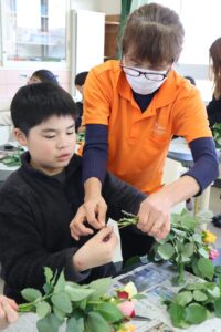 当日は、同組合のバラ生産者5人と婦人部員8人が同校を訪れ、4年生約100人を対象に、同組合が生産したスタンダード4本・スプレー1本のバラを使った花束づくりを指導。あわせて、本数ごとの花言葉を紹介する「ローズナンバーメッセージ」を描いたオリジナルクリアファイルを配布し、花の魅力を伝えました。児童が作った花束は、感謝を伝えるメッセージカードを添えて家族に贈られました。