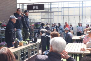 同園の産直部会員で構成するJA西三河ガーデン部会の主催で、花と緑のある暮らしを気軽に楽しんでもらおうと半年に一度開いています。この日は植木や苗木、鉢花、花苗、園芸雑貨など150点以上が出品され、オークション形式で販売されました。オークションに参加した来園者からは「競りの雰囲気が味わえて楽しかった」「お得に買えてよかった」といった声が聞かれ、好評でした。